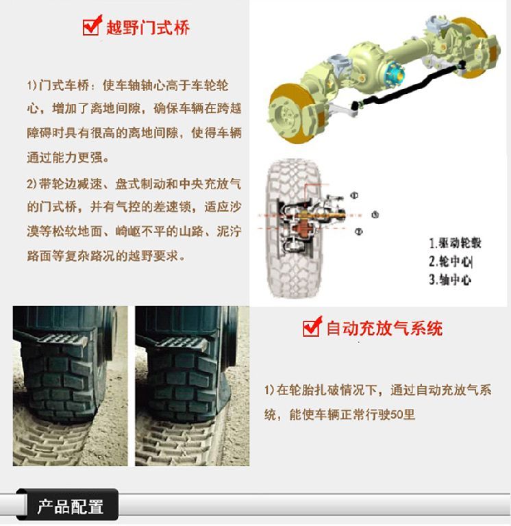 最大爬坡度:≥60% 前后車橋:帶輪邊減速、盤式制動(dòng)器門式橋,并有氣動(dòng)控制的差速鎖