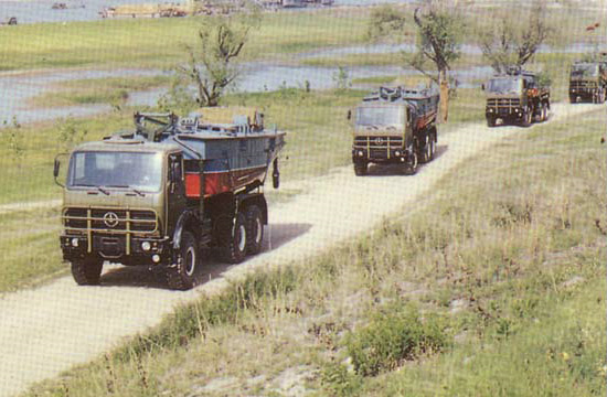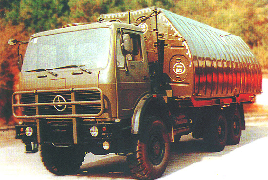 鐵馬XC2200重載卡車在1980年后期進入PLA服役,主要用于運輸重型工程設備和武器系統(tǒng)。中國鐵馬(Tiema) XC2200重載卡車由西南汽車廠(現(xiàn)在北方- 奔馳卡車公司分部)制造,位于重慶(Chongqing)市。卡車以德國梅賽德斯-奔馳2060型卡車為基礎。目前卡車在PLA服役中,被當做重型工程設備卡車和武器系統(tǒng)車底盤。PLA在1970年后期訂購了少量的德國梅賽德斯-奔馳2026型重載卡車(8噸的容量,6X6)補充它不足的重載卡車。這些卡車主要地用于重型火炮拖車任務。PLA對車輛的性能印象深刻,并且接洽梅賽德斯- 奔馳公司去得到許可在中國聯(lián)合生產(chǎn)卡車。鐵馬XC2200(最初即是TM-SC2030)的發(fā)展,梅賽德斯- 奔馳2060型的一個中國仿造型,從1980年早期開始。 西南汽車廠,一個中國北方工業(yè)總公司(NORINCO)位于重慶(Chongqing)市的下屬公司,被選擇當做主承包商。1982年看到了原型的介紹。稍后在1985年中國從西德引進了ZF機械變速箱和KHD413風冷柴油發(fā)動機技術(shù),兩者在鐵馬XC2200卡車上被采用。XC2200批量生產(chǎn)在1986年開始,每年從生產(chǎn)線上生產(chǎn)2,000輛。大多數(shù)的這些車輛被PLA接收用于重貨物/設備運輸、火炮拖車和武器系統(tǒng)車底盤。車輛包括在西藏高地、戈壁沙漠和中國最惡劣的道路和天氣狀況區(qū)域展示了優(yōu)良性能和可靠性。除了被PLA部署,車輛也被輸出到巴基斯坦、泰國、印尼和斯里蘭卡。XC2200采用雙車門正向控制駕駛室,位于發(fā)動機艙上面。駕駛室有四個座位和在頂板有一個天窗。后面的貨物車身的后擋板和側(cè)擋板可放下,可拆卸蓬架和帆布蓬。單預備輪被垂直地安裝在乘員室后面,靠近載貨車箱在駕駛室和后貨物車體之間。這一個空間能用來容納一個修理工具箱和其它的裝載/卸貨設備。與第一代中國自行生產(chǎn)的重型臺車相比較,XC2200有好很多的通用性能,連同85公里/小時的最大道路速度和一個8噸的越野裝載能力。ZF5S-110/111 GPA變速箱有九個前進檔和一個倒車檔。三個車軸和六個車輪全部運行使用速度差速器鎖定裝置,即使當車輛的一側(cè)上一個或更多的車輪沒有與地面接觸中,或已經(jīng)失去牽引,確保車輛持續(xù)驅(qū)動。除了基本的貨物卡車改型之外,XC2200也可得到許多其它的改型, 包括4X4、8X8、長軸距貨車、起重機、掩護所、架橋車、運船車、道路鋪設車和多種武器系統(tǒng)車底盤。中國也已經(jīng)發(fā)展基于XC2200設計的WZ551輪式裝甲人員輸送車(APC)。鐵馬XC2200浮橋架橋卡車。鐵馬XC2200用于WS-1多管火箭發(fā)射裝置車底盤。鐵馬XC2200用于運船車。