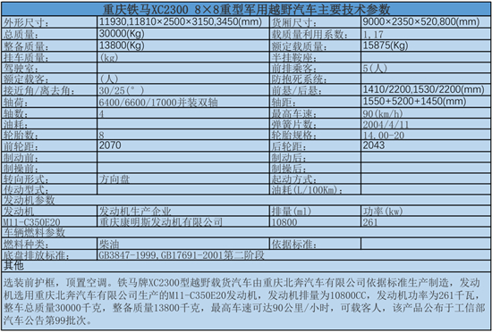 鐵馬牌XC2300型越野載貨汽車由重慶北奔汽車有限公司依據(jù)標準生產(chǎn)制造,發(fā)動機選用重慶北奔汽車有限公司生產(chǎn)的M11-C350E20發(fā)動機,發(fā)動機排量為10800CC,發(fā)動機功率為261千瓦,整車總質(zhì)量30000千克,整備質(zhì)量13800千克,最高車速可達90公里/小時,可載客人,該產(chǎn)品公布于工信部汽車公告第99批次。