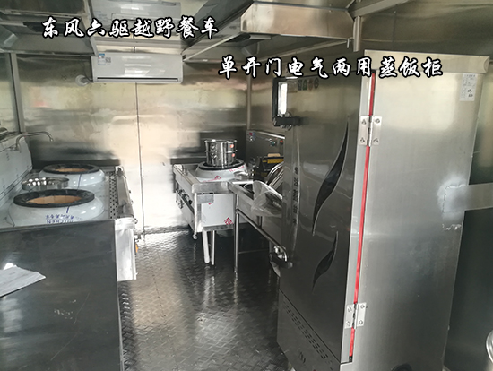東風(fēng)六驅(qū)越野餐車車輛概述:采用東風(fēng)國五越野底盤改裝, 車廂材質(zhì)采用外冷軋鋼板,內(nèi)飾不銹鋼,中間保溫層,隱藏式上車踏步,頂部安全窗,兩個副食灶,一個蒸飯車,抽油煙機(jī),平冷柜,水路,電路,油路等。