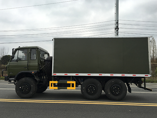 東風(fēng)六驅(qū)越野廂式車采用東風(fēng)越野卡車底盤DFS5160GLJ2 ,東風(fēng)153平頭一排半駕駛室,6*6驅(qū)動(dòng),康明斯210馬力,韶齒6檔變速箱,斷氣彈簧制動(dòng),貫通式中后驅(qū)動(dòng)橋,12.5R20越野胎,軸距 3500+1250mm,加厚雙層大梁,帶軍用保險(xiǎn)杠。六驅(qū)越野廂式車,廂體根據(jù)用戶需要形式多樣,選裝多樣,可以選裝空調(diào)、側(cè)門、側(cè)窗、發(fā)電機(jī)、裙邊結(jié)構(gòu)等.