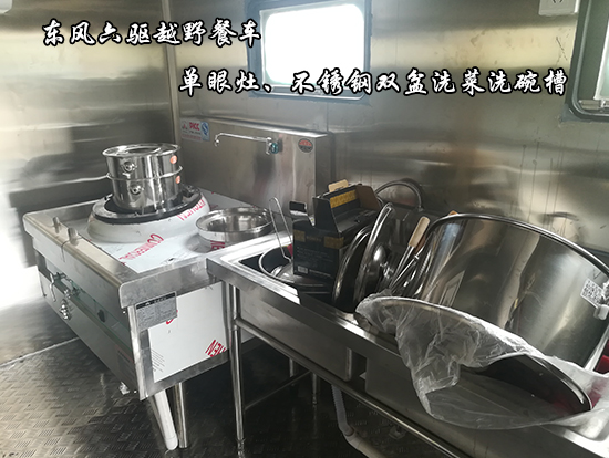 東風六驅越野餐車車輛概述:采用東風國五越野底盤改裝, 車廂材質采用外冷軋鋼板,內飾不銹鋼,中間保溫層,隱藏式上車踏步,頂部安全窗,兩個副食灶,一個蒸飯車,抽油煙機,平冷柜,水路,電路,油路等。