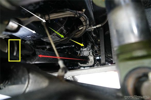 東風四驅(qū)裝甲防雷反恐戰(zhàn)車為前置動力、實時四輪驅(qū)動設定,縱置發(fā)動機(白色箭頭)直接與變速器(綠色箭頭)剛性連接,通過中間傳動軸(黃色箭頭)至分動器,在經(jīng)過前傳動軸(紅色箭頭)與后傳動軸將動力輸出至前后驅(qū)動橋。